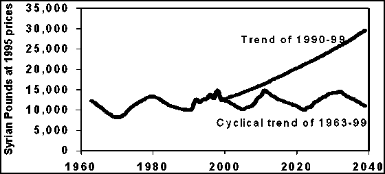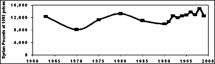 During the last four decades economic growth in Syria has advanced at a rate of 4.6 percent per year on average (between endpoints of the 1963-1999 period). This is a good rate of growth in the long term for many countries. Unfortunately, the growth in population in Syria is also quite high (3.3 percent average over the same period). Growth has accompanied the rapid growth in population, which is a real achievement, but per capita income has remained stagnant in the long-term, alternating ups and downs. The economy has progressed on a cyclical pattern of periods of rapid growth followed by periods of stagnation or decline. The 1990s have been a period of growth, but a decreasing rate, and not strong enough to go beyond the per capita product of 1980, and several factors constrain the continuation of the growth trend in subsequent years. The growth of agricultural production has followed a similar path.