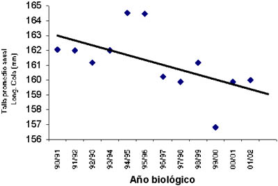 Por otra parte, existe una fluctuación de la abundancia que podría ser de un orden decadal en donde los niveles máximos ya fueron alcanzados en temporadas anteriores y pudiera existir la posibilidad de que el recurso se encontrara en un proceso de tendencia decreciente de las abundancias. Al mismo tiempo se observa que las tendencias del esfuerzo de pesca, medidos en días de pesca, ha aumentado linealmente en el tiempo aun cuando el número de barcos en las flotas se ha mantenido a niveles estabilizados según regulación. Lo anterior implica que la capacidad de pesca existente puede estar significativamente sobre dimensionada si es que en efecto el stock ha entrado en un período decreciente de abundancia.