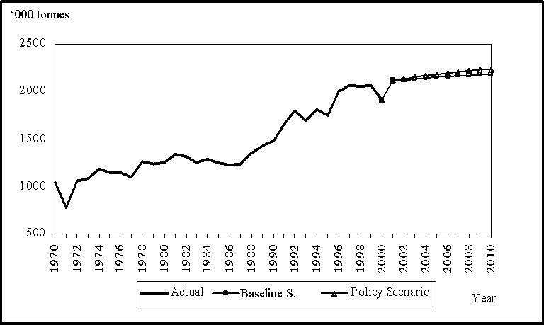 In projecting trade flows in the baseline and policy scenarios no changes were assumed other than those applied to supply and demand. That is, no change is assumed for trade policies in either the baseline or the policy scenarios.