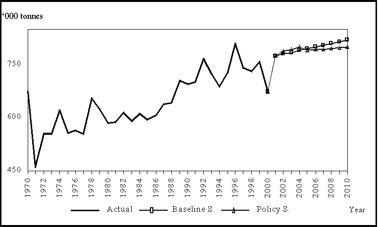Projections of imports for developed countries are shown in Figure 3.17. Imports should continue to increase over the projection period to 2010 but at a much lower growth rate of 0.6 percent in the baseline scenario and 0.8 percent in the policy scenario, reaching an import level of just over 1.7 million tonnes in 2010, up from 1.6 million tonnes in 1998. Imports to developed countries do not share the volatility observed in exports.
