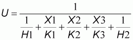 For an insulated container made up of different layers of different materials, the coefficient of heat transmission can be calculated from the following equation: