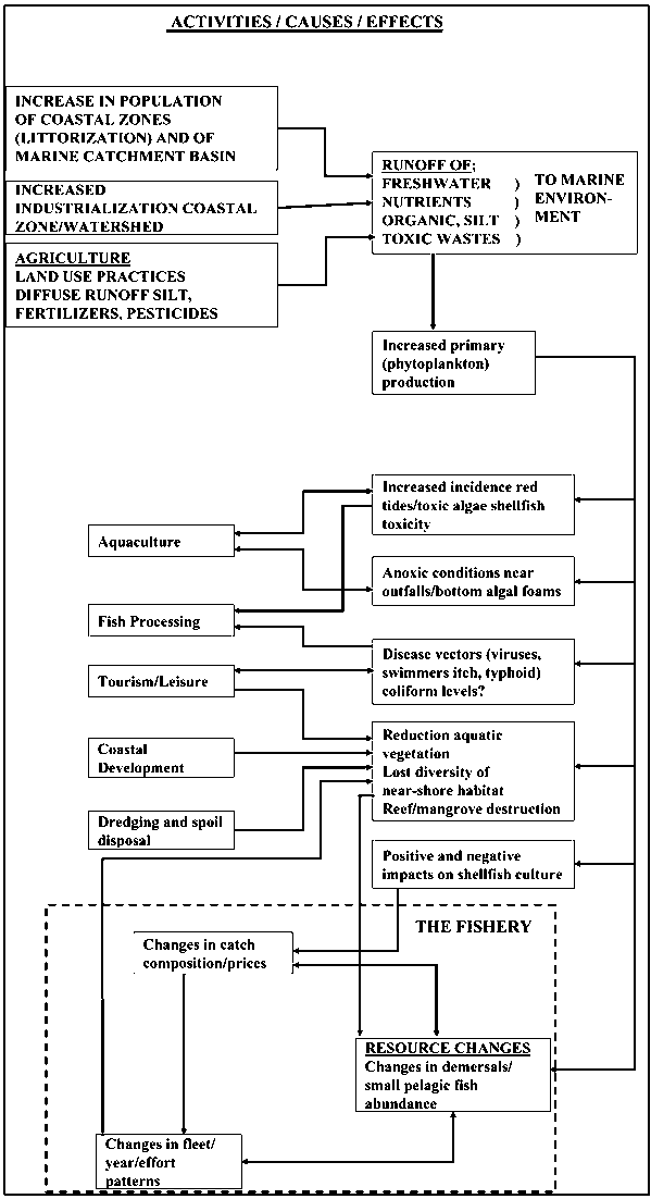 Figure 6.2 attempts to map some of the activities, causes and effects of human activities, starting with those associated with runoff from the adjacent freshwater catchment basin (upper left). This has effects listed on the right (e.g. increased red tides, shellfish toxicity etc) which impact the human activities on the right (e.g. aquaculture, fish processing etc), The fishery and fish culture activities in the box with dotted lines is thus seen as small "downstream" components vulnerable to these non-fishing anthropogenic effects.