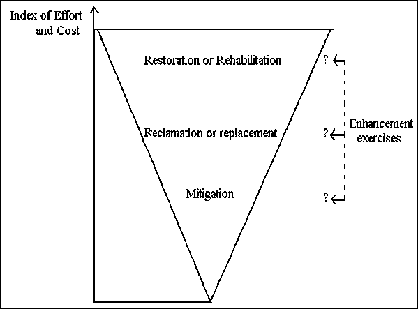 Enhancement, which in the strictest sense implies "improving on nature" would imply even more costs since an "enhanced" system is implied to be an improbable state differing from the equilibrium situation often characterized by the term "virgin conditions". In fact however, enhancement becomes more feasible when it is considered in the context of restoring an ecosystem after serious stock depletion, and is also appropriate for systems which are recovering from disturbance, where for example an unfilled ecological niche may be temporarily present. It is mainly in this sense that the term is used in this paper, so the apical position of enhancement in Figure 6.6 is probably anomalous.