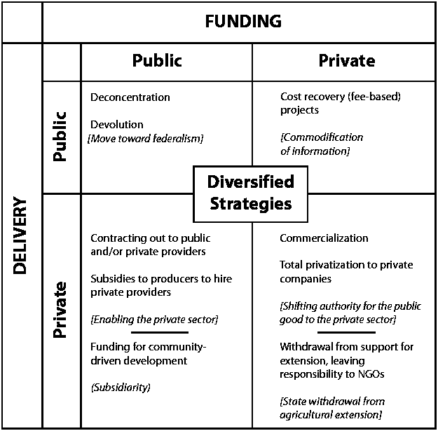 The central rectangle refers to situations where governments employ several strategies (e.g., devolution, partial privatization, and/or cost-recovery measures to foster extension activities for agricultural development). This phenomenon should not be confused with "institutional pluralism" that refers to the fact that various sectors are engaged in extension provision.