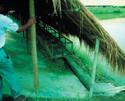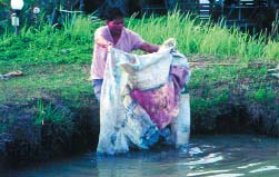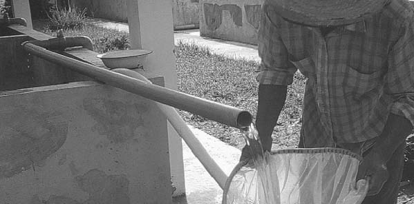 A major problem with upgrading scavenging poultry flocks to a size that their manure can have an impact on fish production is poor survival of starter birds, and poor availability and/or cost of supplementary feed for growing birds. The strategic use of higher quality feed for starters and use of alternative supplementary feed for adults can increase flock size, and quantities and qualities of waste available (Khalil, 1989). The adoption of heat stable vaccines to prevent Newcastles disease has had a major impact in areas where available (Alders and Spradbrow, 2000). The collection of waste from scavenging poultry overnight is often possible even when they remain unconfined; roosting of birds over ponds can be encouraged with strategic feeding and placement of perches/ cover. Manure can even be collected under tree branches or within housing by placing sheeting under roosting positions and feeding stations. The sheets, which can be old textile material or split fertilizer bags can then be washed or suspended in the fishpond.