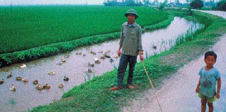 Herding ducks in the Red River Delta. Overnight confinement and supplementary feeding allows collection of wastes for use in fish culture