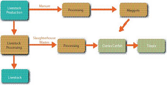 BOX 3.H Green blowfly larvae used to process pig manure to fish feed Limited land and/or water availability may preclude conventional integrated waste-fed aquaculture. The production of a live feed, such as the green blowfly larvae, Lucilia sericata, on pig manure and its use as a substitute for a pelleted feed for intensively raised African catfish (Clarias gariepinus) in cages placed in ponds stocked with Nile tilapia (Oreochromis niloticus) was demonstrated. Key outcomes were