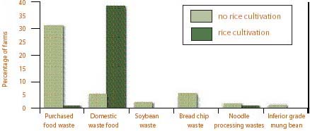 Adding value to livestock wastes through simple on-farm processing has now developed where conditions are suitable: typically in the vicinity of larger towns and cities; and usually by entrepreneurs well connected with urban markets. In one study, livestock processing wastes in Pathum Thani, Thailand were more commonly used by farmers with diversified farming systems (livestock, fish, vegetables, orchard), than rice farmers adopting fish production (Edwards et al., 1983). Location of aquaculture within peri-urban zones also makes the use of other agro-industrial by-products possible. These include waste human food from canteens and restaurants and food processing wastes. In Thailand and some other parts of Asia, noodle processing waste, stale noodles and bread products, and soybean, brewery and distillery wastes are commonly used. Many of these products are also used for feeding livestock, particularly pigs (Figure 11).