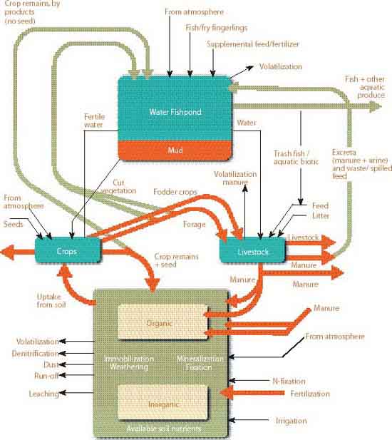 Agroecosystems differ from natural, unmanaged ecosystems in their larger and more rapid turnover of nutrients. Such systems producing food or fibre are therefore more open for nutrient transport across boundaries (Frissel, 1977; Tivy, 1987). Moreover, the level of nutrient inputs used can define the intensity of farming. Modeling of nutrient cycling is well established for conventional agriculture (Figure 13) but analysis of agroecosystems involving crops, livestock and fish is recent. Understanding how a pond stocked with fish affects fluxes of nutrients through the farm can be critical to developing more efficient and less polluting agriculture, animal husbandry and aquaculture.