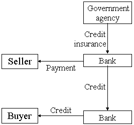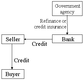 Another common system focuses on the sellers bank (Figure 3). As in the previous scheme, the seller provides a credit, e.g. through a promissory note, to an overseas buyer. He does this under a credit line provided by his bank; his bank, in turn, can refinance itself cheaply with a government bank (e.g. in Brazil, Pakistan and Thailand), or can obtain a credit risk coverage from a government agency (e.g. Malaysias ECR scheme or the United States SCGP programme). In these schemes, the seller retains a large credit risk vis-à-vis the buyer: he has to reimburse his bank for all or part of his credit (e.g. 35 percent in the case of the US SCGP programme) even if the buyer defaults.