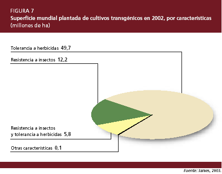 Los cultivos transgénicos más difundidos son la soja, el maíz, el algodón y la nabina. Las características más comunes son la tolerancia a herbicidas y la resistencia a insectos. La soja y la nabina tolerantes a herbicidas ocupan actualmente el 55 por ciento y el 16 por ciento, respectivamente, de la superficie mundial plantada de esos productos. Las variedades transgénicas de algodón y maíz actualmente cultivadas con fines comerciales incluyen características de resistencia a insectos y tolerancia a herbicidas, o una combinación de ambas, y representan el 21 y el 11 por ciento, respectivamente, de la superficie total destinada a estos cultivos (James, 2003). También se cultivan con fines comerciales pequeñas cantidades de papayas y calabazas transgénicas resistentes a virus. En la actualidad no se producen comercialmente en ningún lugar del mundo variedades transgénicas de trigo o arroz, que son los principales cereales alimentarios.