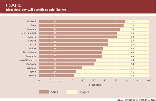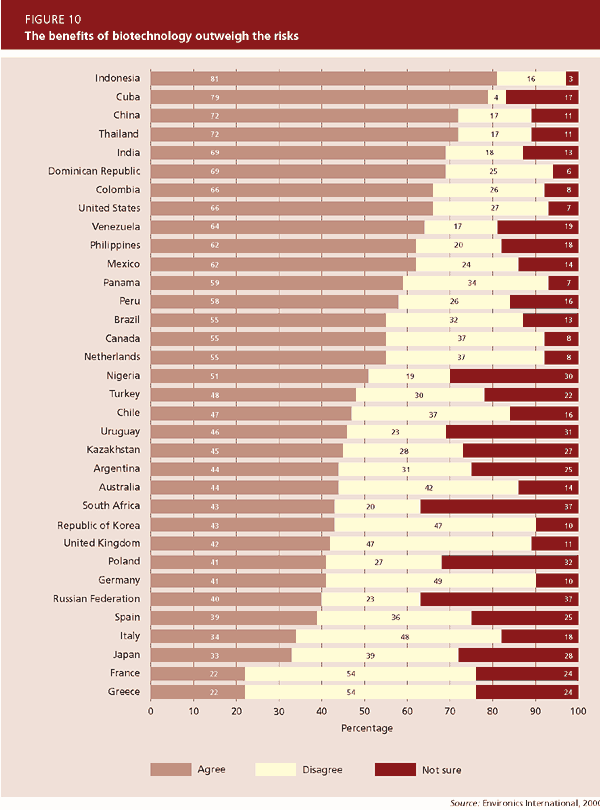 The most extensive international study of public perceptions of biotechnology is a survey of about 35 000 people in 34 countries in Africa, Asia, the Americas, Europe and Oceania (see list in Figure 10) and conducted by Environics International9 (2000). About 1 000 people in each country were asked the extent to which they agreed or disagreed with the following statement: