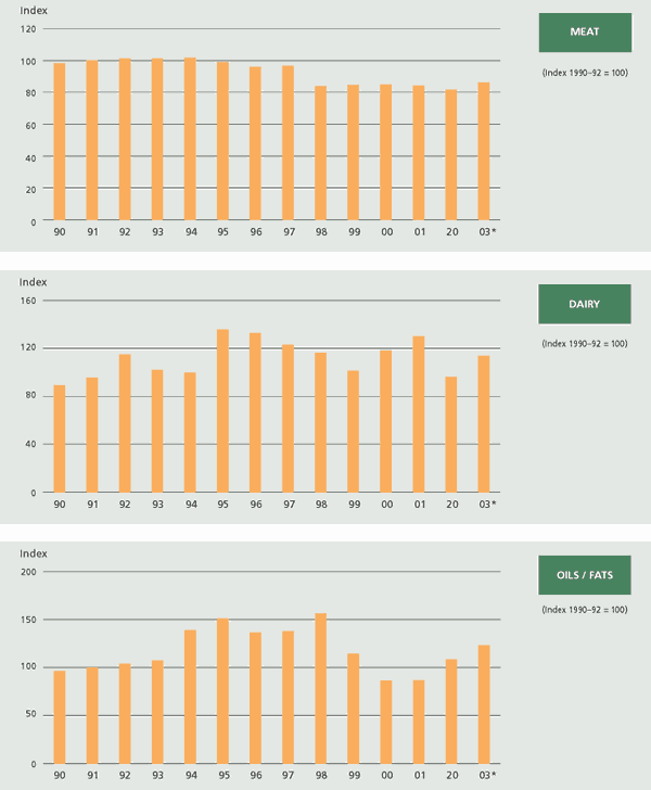 - The rate of growth of global crop and livestock production has slowed in each of the last three years, following the strong output growth recorded in 1999 (Figure 20). The slow rate of growth in 2002 of less than 1 percent at the global level implies a reduction in output in per capita terms.