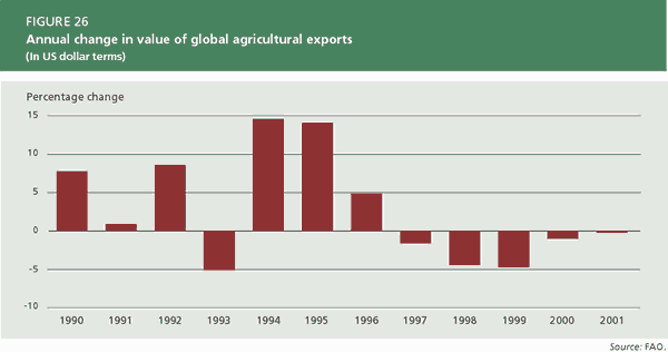 - After a relatively strong expansion in the mid-1990s, global agricultural exports have been declining in value terms between 1997 and 2001 (Figure 26), leading to a further reduction in the share of agricultural trade to less than 7 percent of total merchandise trade - in continuation of the long-term trend in this direction (Figure 27).