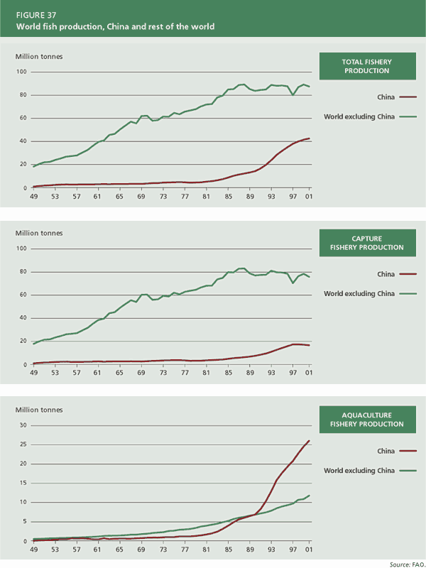 - World aquaculture production has been increasing rapidly in recent years and now accounts for almost 30 percent of total fisheries production (Figure 37). Most of the expansion has been attributable to China, which is now responsible for more than two-thirds of total aquaculture production in volume terms.