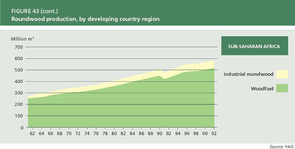 - The larger part of this production, 2 015 million cubic metres or 60 percent of the total in 2002, was accounted for by developing countries (Figure 42).