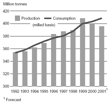 Global paddy output in the 2001 season was 591.1 million tonnes (395.3 million tonnes in milled equivalent), about 7 million tonnes less than in 2000 and 19 million tonnes below the all time high reached in 1999 (Table 1). The fall in 2001 reflected to a large extent a reversal of policies in China. Confronted with huge rice inventories and the need to prepare for an increase in cereal imports following the country's accession to the World Trade Organization (WTO), most producing provinces had started reducing the level of support or "protective" rice prices in 1999 and even abolished them in 2000 in the case of early rice. These changes, together with summer drought problems, caused China's paddy production to slide to 177 million tonnes in 2001, the lowest level since 1993. In the rest of Asia, paddy output fell in Indonesia, the third largest producer, reflecting a shift in plantings and recurring flooding problems. Crop diversification and storms negatively affected also the summer/autumn crop in Viet Nam, resulting in an overall contraction in output, while lingering dry spells reduced considerably the availability of irrigation water in Pakistan, causing a 21 percent drop in production. Drought continued to afflict the Islamic Republic of Iran, constraining plantings and hindering a recovery. Production also fell in Japan, Sri Lanka and Thailand. On the other hand, relatively good monsoon rains boosted production in India to 135 million tonnes, the highest performance in history. Favourable growing conditions combined with government support to the sector also sustained an increase in Bangladesh, Myanmar, the Philippines and the Republic of Korea.
