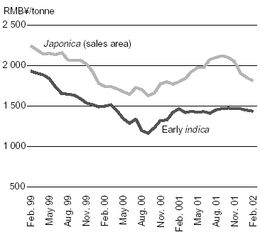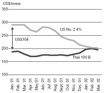 International rice prices have shown signs of a recovery in the first three months of 2002, with the FAO price index averaging 91 in January and February, two to three points above the monthly levels that have prevailed since August 2001. However, prices softened somewhat in March, when Viet Nam re-entered the market and the index fell to 90. In the first three months of 2002, Thai prices tended to strengthen, sustained by government procurement purchases. By contrast, large domestic supplies from the excellent 2001 crop continued to exert a strong downward pressure on rice quotations in the United States. As a result, most prices of rices of United States origin fell in the first three months of the year. The divergence of trends in Thailand and the United States significantly narrowed the price differential traditionally existing between similar rices from the two origins. For instance, the price premium enjoyed by the United States on the high-quality long grain, which had averaged US$86/tonne in 2001, fell to US$6/tonne in March 2002. More generally, rice from Thailand and Viet Nam were priced higher in March 2002 than one year earlier, while rice from India, Pakistan and the United States tended to be valued less.