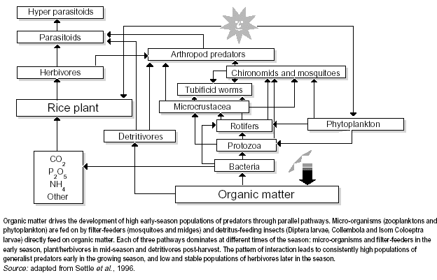 Studies by Settle and farmer research groups in Indonesia (Settle et al., 1996) show that flooding of fields triggers a process of decomposition and the development of an aquatic food web, which results in large populations of detritus-feeding insects (especially Chironomid and ephydrid flies). These insects emerge onto the water surface and into the rice canopy in large numbers, very early in the growing season, providing critical resources to generalist predator populations long before "pest" populations have developed (see Figure 1). This model is quite different from the usual predator-prey models taught in most basic IPM courses and provides a mechanism to suggest that natural levels of pest control in tropical irrigated rice ecosystems are far more stable and robust than in purely terrestrial agro-ecosystems. This stability, however, was found to be lower in rice landscapes that are subject to long (more than three months) dry seasons and where rice is planted in large-scale synchronous monocultures, as well as in areas where farmers use pesticides intensively. A corollary to this idea is the result that increasing amounts of organic matter in the soil of irrigated rice fields - by itself a highly valuable practice for sustainable nutrient management in tropical irrigated rice - has boosted the populations of both detritus-feeding insects and insect predators, thereby improving natural levels of pest control (Settle et al., 1996).