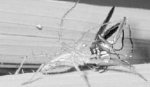 BOX 2 Predators are the most important natural enemies of the brown planthopper. Together with parasitoids and insect pathogens they keep down populations of this pest. An important group of predators commonly found in rice fields is spiders. Of particular importance are the hunting spiders, especially Lycosa pseudoannulata. It is often found near the water level, which is where the brown planthopper feeds. A lycosid is known to feed on as many as 20 planthoppers per day. Its voracious appetite makes it a very important natural enemy. However, one of the questions often asked about this predator is: "What will it feed on in the absence of brown planthoppers?" Like other spiders, Lycosa and Oxyopes do not depend entirely on planthoppers for food. There are many flies in the field, which provide the bulk of the food for spiders. Studies in Indonesia have shown the importance of "neutrals" in supporting a large population of predators in the rice fields. Spiders are found in rice fields before planting, when they survive on these "neutrals". During the dry season, rice field spiders are known to hide in crevices or in grasses around the field. Like all predators, spiders are very susceptible to insecticides; hence, sprays or granular applications into the water will destroy these beneficial arthropods, allowing brown planthoppers to multiply in large numbers. A Lycosa feeding on a brown planthopper