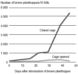 BOX 4 In exclusion cage experiments, cages were initially cleaned of all arthropods. Pairs of brown planthoppers (one pair per hill) were introduced into the cage. After 24 hours, some cages were opened at the bottom to allow predators in but keeping in the brown planthoppers. One and half months later, brown planthopper populations had reached very high levels in cages where predators were kept out (closed cage) while populations remained low in cages where predators were present (cage opened). This simple experiment is one of the most effective ways of showing that predators are important in keeping brown planthopper populations low.