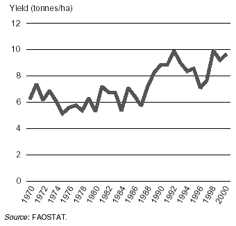 From 1973 to 1985, rice yield in Australia stagnated at around 6 tonnes/ha (Figure 1). During the 1980-84 period, Calrose, a tall-strawed, medium-grain variety, accounted for 60-77 percent of total production. The yield distribution data for Calrose crops in the 1981/82 season showed a wide variation of yields among individual rice farms. The average yield of 1 343 rice farms in the Murray Valley region was 6.8 tonnes/ha. The average yield of the 10 percent highest-yielding rice farms was more than 9 tonnes/ha, while that obtained by the 25 percent lowest-yielding rice farms was less than 5.25 tonnes/ha. The highest-yielding 10 percent of farms achieved yields some 50-60 percent higher than those of the lowest 25 percent yielding farms (FAO, 2001a).