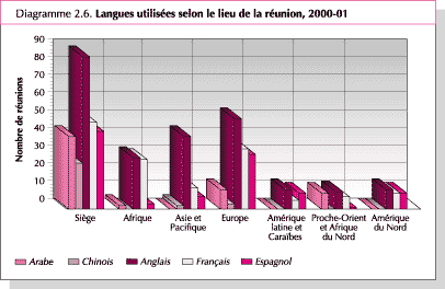 53. Les langues utilisées lors des réunions sont décidées par l'organe qui convoque la réunion en fonction du lieu où celle-ci se déroule et de l'origine géographique des participants. C'est pourquoi, l'utilisation relative des différentes langues lors des réunions n'a pas beaucoup changé par rapport à l'exercice précédent. L'anglais est la langue prédominante pour les réunions tenues au siège, ainsi que dans la région Asie-Pacifique et en Europe. En Afrique, le français et l'anglais sont utilisés pratiquement à égalité. En Amérique latine et dans les Caraïbes, les principales langues sont l'espagnol et l'anglais. Au Proche-Orient et en Afrique du Nord, ce sont l'arabe et l'anglais (Diagramme 2.6).