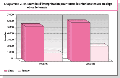 55. La tendance à utiliser davantage de langues dans les réunions a entraîné une augmentation sensible du nombre de journées d'interprétation assurées pour des réunions de la FAO pendant l'exercice biennal4. Le nombre total de journées d'interprétation enregistré pour l'exercice biennal s'élève à 8 655 jours, soit une augmentation de 25 pour cent par rapport à l'exercice 1998-99. Comme indiqué dans le Diagramme 2.9, l'augmentation la plus conséquente concerne le chinois (+42 pour cent), suivi de l'arabe (+27 pour cent), du français (+ 24 pour cent), de l'anglais (+21 pour cent) et de l'espagnol (+15 pour cent). Le nombre de journées d'interprétation a augmenté tant au siège que sur le terrain, où un certain nombre de réunions ont été financées grâce à des ressources extrabudgétaires (Diagramme 2.10).