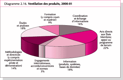 82. Le Diagramme 2.16. indique la répartition des réalisations, par type de produit. Les produits relevant de l'appui aux États Membres et au terrain ont représenté 22 pour cent du total, les études et analyses et l'information se situant à 18 pour cent, la coordination et l'échange d'informations à 16 pour cent et les méthodologies et directives à 14 pour cent. Les autres catégories de produits s'échelonnent entre 9 pour cent pour la formation et 3 pour cent pour les engagements, les accords/conventions et les normes internationaux.