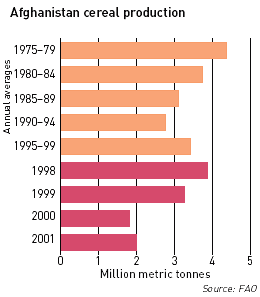 Even before the events of 11 September 2001, Afghanistan was gripped by a serious food crisis. After a third year of drought, cereal output in 2001 fell to barely half the production in 1998. Livestock herds, which are critical to the country's economy and food security, had been reduced by an estimated 40 percent. Requirements for food imports for 2001-02 reached a record level of 2.2 million tonnes, but commercial imports dropped sharply when warfare erupted. Food aid increased but not enough to meet the needs of almost 10 million people, entirely dependent on food assistance. Hunger and malnutrition have increased sharply in a country where stunting of children was reported to be as high as 52 percent in 1998, even before drought set in and food production plummeted. Cereal production has rebounded significantly in 2002, buoyed by increased rainfall and better access to agricultural inputs. Output is expected to surpass the poor levels of the past three years, although still falling short of the 1998 harvest. Despite this recovery, millions of people remain in need of food assistance. After years of conflict and drought, many families have exhausted their assets, have suffered deaths and disabilities or have been driven from their homes. Many of the country's irrigation systems lie in ruins and about half of the irrigated area has gone out of use. Large-scale investment is urgently needed to repair rural infrastructure and restore crop and livestock production.