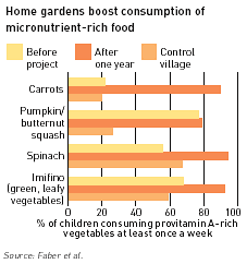 A home gardening programme focusing on production and consumption of vegetables rich in vitamin A and its precursor, beta carotene, has been successfully demonstrated by the Medical Research Council of South Africa in a mountainous, rural village in KwaZulu-Natal. Prior to the programme, the diet of children in the village consisted mainly of maize porridge, bread and rice. The lack of variety and vitamin-rich foods resulted in high incidence of vitamin A deficiency. The programme changed that by promoting cultivation of vegetables, such as carrots, pumpkins and spinach, that are rich in beta carotene and by teaching villagers, especially women, the importance of including them regularly in their diet. After only one year, the percentage of children consuming vitamin-A rich vegetables had increased significantly. And the increased diversity in their diets led to measurable improvements in vitamin A status.