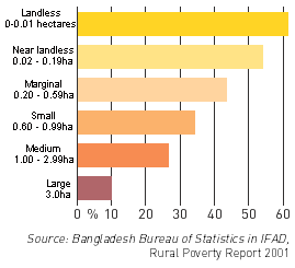 More than 45 percent of the rural population of Bangladesh own less than one-quarter of a hectare of land. And more than half of these landless and near-landless farm families live in extreme poverty. Share of rural population by farm size, 1988-89