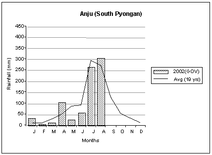 In winter 2001/02, there was less snowfall compared to the previous year. The onset of spring, on the plains and lowlands, was reported as "earlier than normal". Rainfall was experienced nation-wide from mid-April to mid-May. This was followed by a relatively dry period of several weeks until normal expected precipitation patterns were experienced during July-August, duly confirmed by meteorological stations' reports. Intense precipitation in August was reported in a belt from Nampo, Pyongyang, South Pyongan, North/South Hwanghae, Kaesong to Kangwon. There was considerable flooding in Anju and neighbouring counties, in South Pyongan. The September typhoon struck the Korean peninsula further south, but effects were felt mainly in Kangwon and along parts of the East Sea coastal counties.