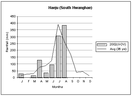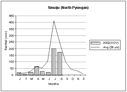 Figure 1 shows the 2002 rainfall data compared with the long term average from four representative stations located in the major food producing areas of DPR Korea.