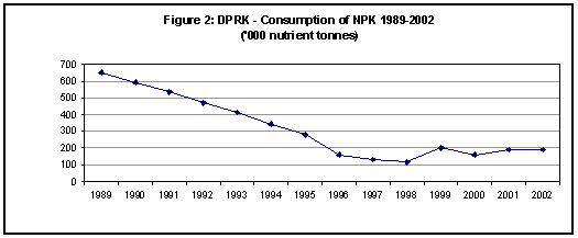 According to the Ministry of Agriculture, the availability of fertilizer in 2002 amounted to some 189 000 tonnes of NPK nutrient equivalent, about 1 000 tonnes less than in 2001. In addition, as mentioned in the UN Consolidated Appeal (CAP 2002) document, donations of 200 000 tonnes from the Republic of Korea and 123 785 tonnes from the EU were received and earmarked for 2002 main season crops. It is not clear whether these amounts had been taken into account in the MoA's calculations, nor is it clear whether there is any of this "bilateral stock" available for 2002/03 winter/spring or the main summer crops. Another 100 000 tonnes being provided by the Republic of Korea is earmarked for the 2003 cropping season.