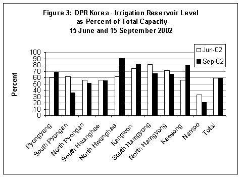 The irrigation pattern in DPR Korea is dependent on the availability of water in the reservoirs and rivers. In 2000 and 2001, water levels were very low and reservoirs dangerously below normal capacity. However, an abundance of well distributed rains in summer 2001, sustained this year from mid-April through September has maintained satisfactory levels in most irrigation reservoirs. By September 2002, water volume levels in eight major stations were reported to be in excess of 50 percent of normal capacity, and averaging 59 percent nation-wide. (Figure 3).