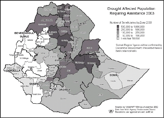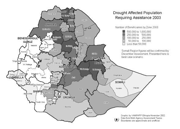 Dire Dawa, Harari and Oromiya: The crisis in eastern Oromiya, Dire Dawa and Harari, comes after declining agricultural production since 1999 due to extended drought. The extended lean season in August/September 2002 in the eastern part of the region resulted in a rapid and dramatic decline in nutritional status. Malnutrition rates in affected areas like East and West Harerge reached over 15 percent Global Acute Malnutrition (GAM). Massive efforts to improve the situation through the provision of food aid have slightly ameliorated the problem. However with yet another significant decline in production in the lowlands, the situation will remain very precarious. For some years, the area, which is chronically food insecure, has had small-scale migration during lean seasons. This latest crisis has accelerated rates of migration with more than 20,000 people presently living in internally displaced persons camps in Bale Zone and another 5000 in East Shewa Zone. Contrary to expectations that communities would cope in the normally surplus-producing areas, signs of food stress such as declines in school attendance indicate a rapidly deteriorating situation-40 percent dropouts in 2002 versus 13 percent in 2001.