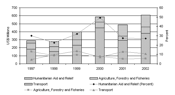 Official Development Assistance (ODA) for Ethiopia has been increasing since 1997. However, the country still has the lowest per capita development assistance and highest per capita humanitarian assistance in sub-Saharan Africa and the Least Developed Countries (LCD). The largest component of ODA between 1997 and 2002 was humanitarian aid and relief (Figure 1). On average about 30 percent of ODA funds are allocated annually for humanitarian assistance compared to 8 percent for agriculture and 10 percent for transport infrastructure.