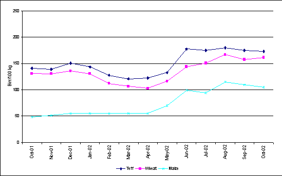 Grain prices remained severely depressed till about mid 2002. The decline in prices was largely attributed to above average harvests in the previous two years with little or no effective price stabilization mechanisms. In the latter half of 2002 grain prices began to increase sharply with the expected poor grain production. In October 2002, average prices of maize, wheat, barley and sorghum were respectively 85 percent, 50 percent, 32 percent, and 25 percent higher than at the same time last year. Consumers and producers alike are suffering from such severe price volatility. There is an urgent need for effective price stabilization mechanisms.