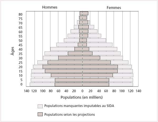 Les projections démographiques montrent que le VIH/SIDA bouleverse radicalement la structure de la population par âge et par sexe ainsi que sa densité (figure 2). On prévoit, outre une baisse démographique globale, une modification de la composition par sexe et par âge de la population qui se traduit par une augmentation du nombre de personnes âgées et de jeunes. Dans nombre de pays, le SIDA réduit à néant tous les progrès qui ont pu être accomplis au cours des dernières décennies dans le sens dune réduction du taux de mortalité et dun allongement de lespérance de vie. Celle-ci est désormais de 47 ans dans les pays dAfrique subsaharienne, alors quelle aurait dû atteindre 62 ans sans la pandémie. Au Botswana, par exemple, lespérance de vie à la naissance na jamais été aussi basse depuis 1950 (ONUSIDA 2002).