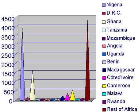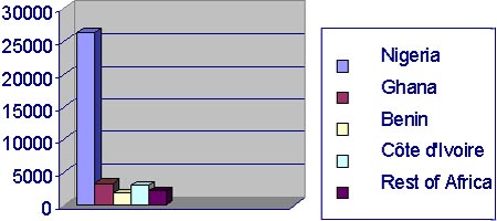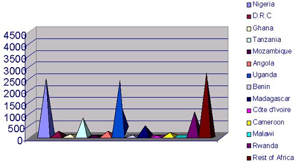 In terms of contribution of roots, tubers and derived products to calorie requirements, it should be noted that root and tuber crops contribute more than 600 calories per caput per day in the following countries: Angola, DRC, Congo-Brazzaville, Central African Republic, Mozambique, Ghana, Côte d'Ivoire, Rwanda, Togo and Benin. It is interesting to note that, although Nigeria is the largest producer of root and tuber crops in Africa, the contribution of these crops to calorie requirements is not the highest among the concerned countries (about 570). This can be explained by the great variety of sources of calories that are available in Nigeria.