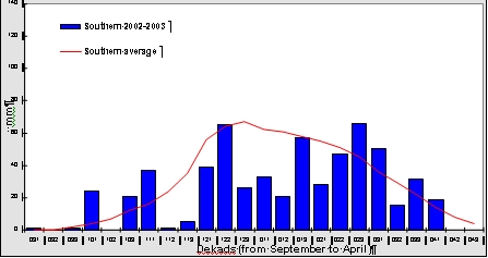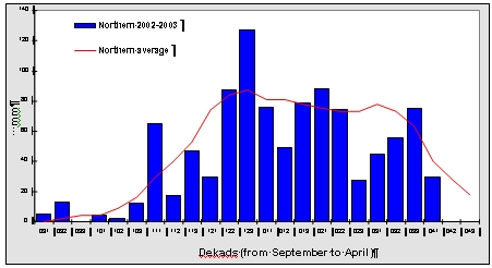 In most parts of Zambia, rainfall during 2002/03 was markedly better for crop production than it was in the 2001/02 season. Though there were some false starts to the season, extensive re-seeding was usually not required except in the south where farmers reported having to replant as many as three times. Figures 1 – 4 2 indicate rainfall patterns in Zambia in 2002/03 cropping season from September 2002, dekad 1 (091) to 2003, dekad 3 (043). Figures 1-3 show reasonable conformity to the long-term average in the north, east and west of the country, while Figure 4 shows a rather less favourable, more erratic pattern in the south, where total rainfall is generally lower than elsewhere. Nevertheless, although some areas in the south experienced drier conditions this year than last, and received less than half of their expected total annual rainfall, others were close to the average and received considerably more rain than during the previous season.