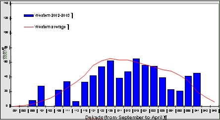 Rainfall in Copperbelt Province was above normal in 2002/03. The season started in late October and, apart from a relatively dry spell of two to three weeks in November, continued until the beginning of April. The end of the season brought some unusually heavy rains which were occasionally damaging to crops, but otherwise the rainfall distribution was satisfactory.
