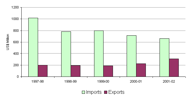 Lesotho’s current account deficit for 2001/02 is estimated at US$ 72.3 million and capital and financial accounts at US$ 111.5 million. The trade deficit is estimated at US$ 353.8 million with exports accounting for 47 percent of the total imports (Figure 1). The key exports remain textiles, footwear, mohair and some live animals.