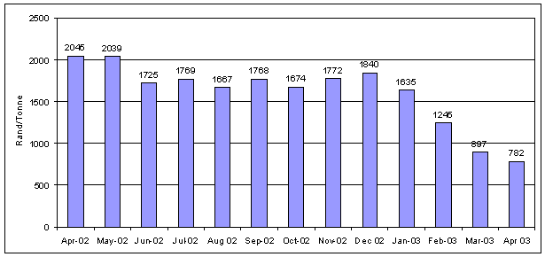 The maize SAFEX (South Africa Futures Exchange) prices anticipating another good harvest have declined from a high of R 2045/tonne in April 2002 to R 782/tonne in April 2003 (Figure 4). It is expected that the appreciation of the Rand will contribute to reduced demand from other regional countries for South African commodities including cereals as they have become relatively more expensive. Countries that normally import cereals from South Africa may look to international markets elsewhere. Swaziland and Lesotho are the only regional countries that are not impacted by the appreciation of the Rand as their currencies are pegged at par with it.