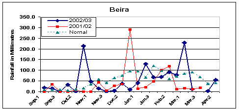 The rains in 2002/03 started on time in the last dekad of November and continued until the last dekad of March. Rainfall was above normal and well-distributed throughout the province (even in the usually drought-prone districts of Lago, Mandimba, Cuamba and Macanhelas), resulting in very good crop yields for this season.