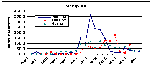 The rains in 2002/03 started on time in the last dekad of November and continued until the last dekad of March. Rainfall was above normal and well-distributed throughout the province (even in the usually drought-prone districts of Lago, Mandimba, Cuamba and Macanhelas), resulting in very good crop yields for this season.