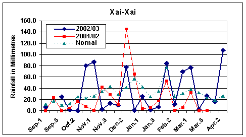 The main growing season starts with the first rains in September in the south and December in the north. There is also a minor growing season that extends from March to July, based on residual ground moisture, that accounts for approximately 10 percent of total output. Figure 1 shows rainfall for selected locations in the south, centre and north in 2002/03.