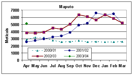 The skewed distribution of cereal production between regions will translate into serious food shortages in southern provinces and abundant supplies in the north and centre. Prices of maize are below their levels of last year but they are significantly higher in southern markets. High transport costs to move the maize from the North to the South, coupled with reduced export opportunities due to improved cereal harvests in neighbouring Zambia and Malawi, are likely to result in large volumes of stocks in the Northern and Central regions. The shortfall in the South and part of the Centre is expected to be covered by food aid and commercial imports.