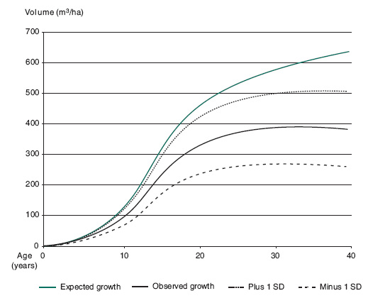 The expected growth continues to rise over the period modelled, but the mean simulated volume levels out after about year 30 as the influence of the combined disturbances negates the expected increases in yield. Until age 5 the average simulated growth is about the same as the expected yield, but by age 10 there is a discernible difference. At age 15 even the top 16 percent of stands (those one standard deviation above the mean) start to deviate markedly from the expected yield curve. At age 30, the mean simulated yield is 37 percent lower than the expected yield.